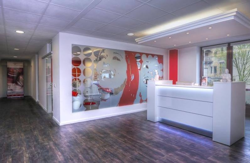 Bei Edel und Weiß ist eine stahlend weiße Hochglanztheke mit Beleuchtung der Mittelpunkt im Empfang. Genau wie die Ergebnisse der Praxis sieht man hier einen weißen Empfangstresen der frisch und freundlich die Kunden empfängt und den Wert besonders auf die zu erwartende Ästhetik und Perfektion focusiert. Behandlungsräume und Empfangmöbel in Emnpfangsbereichen und Wartezonen lassen den Kunden verweilen und sich einfach gut aufgehoben wissen mit der Sicherheit eine professionellen Behandlung zu genießen.